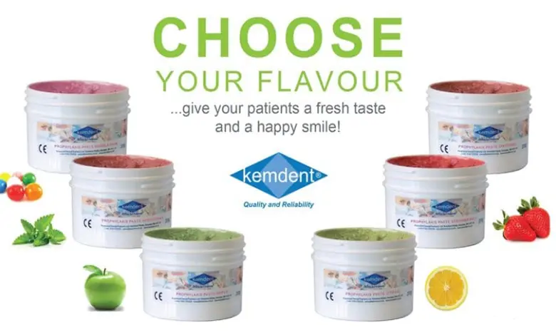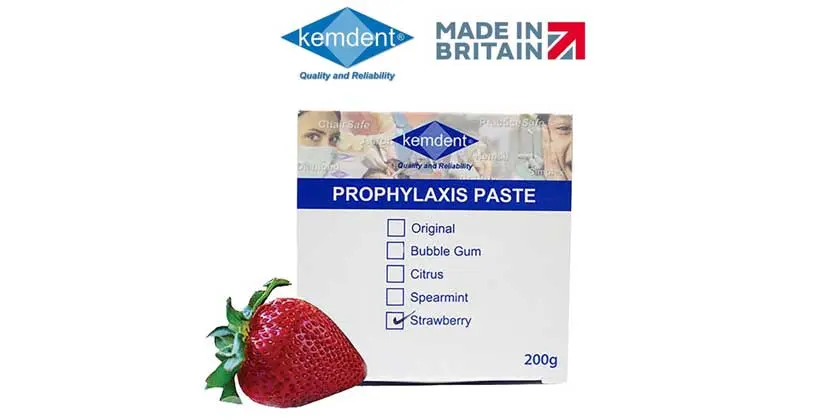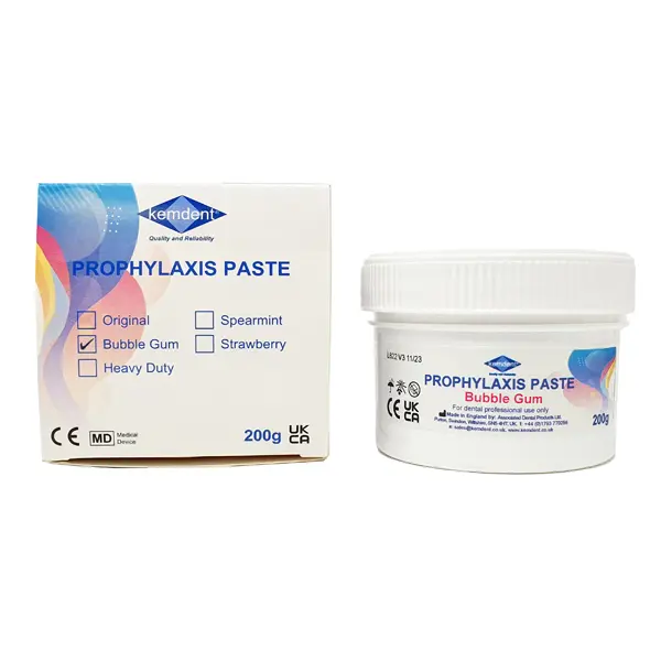This is a unique Kemdent formulation which is clean to use. 5 fresh flavors designed for greater patient acceptance. Special viscosity ensures that paste clings to the prophylaxis brush and will not splatter. Two grits are offered, medium for normal use and heavy duty providing greater removal rate.